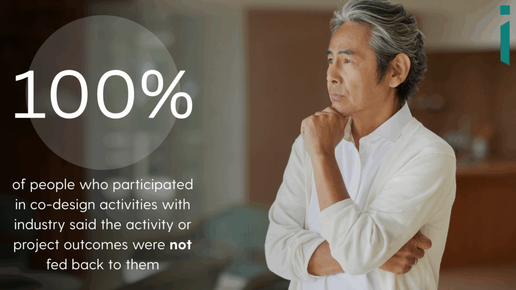 Incredibly concerning was the blanket response we got to the following question aimed at those who had participated in co-design activities with industry: were the activity or project outcomes fed back to you? All—100% of respondents said no. This underlines the critical issue with lack of communication. A clear area where industry must do better with.