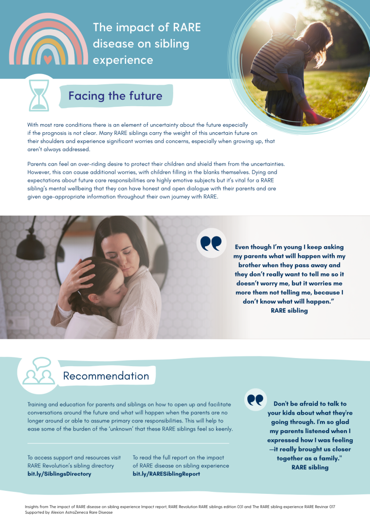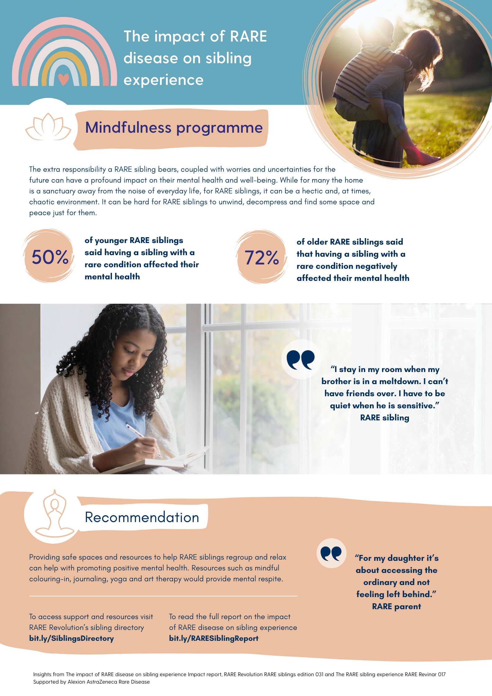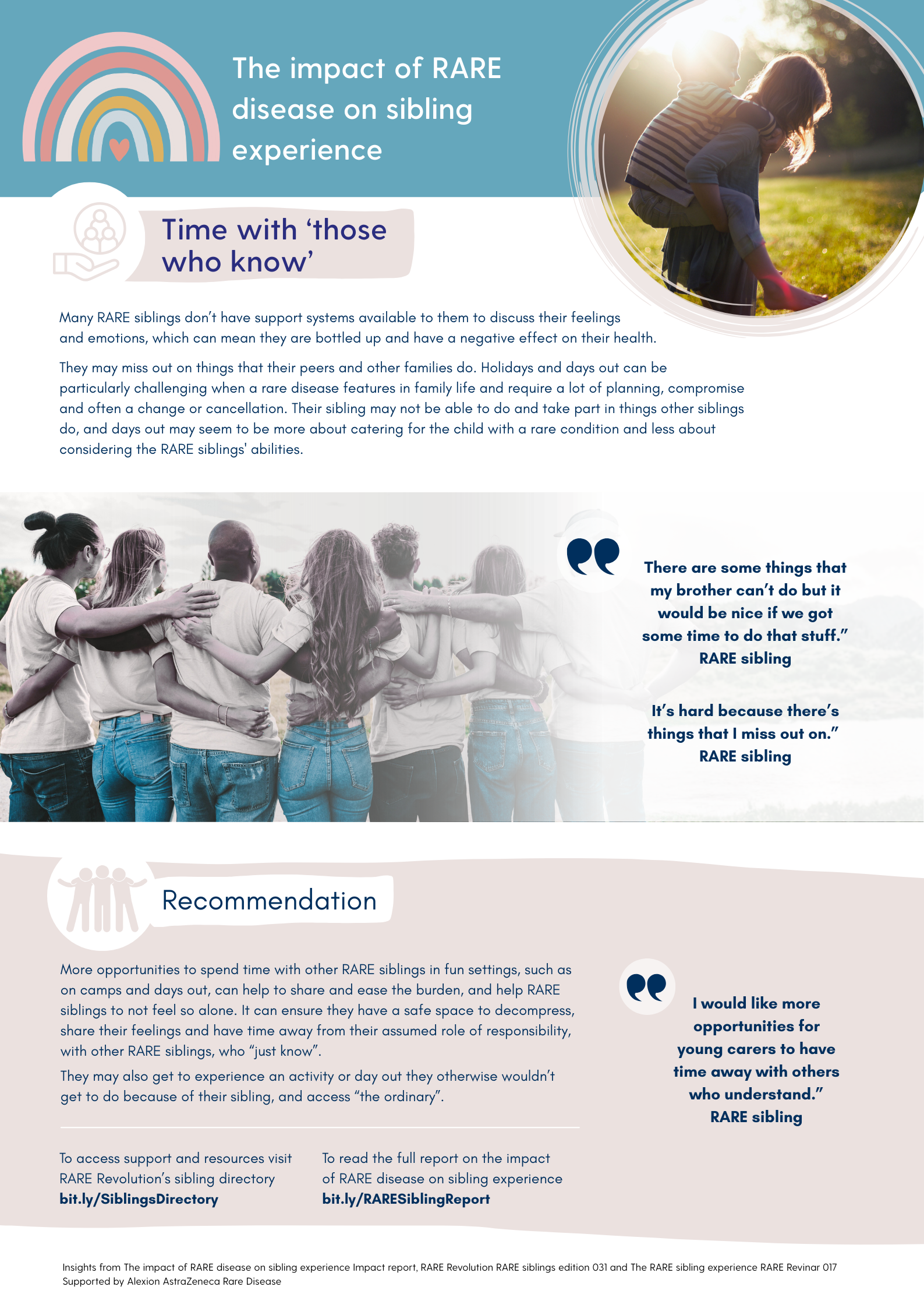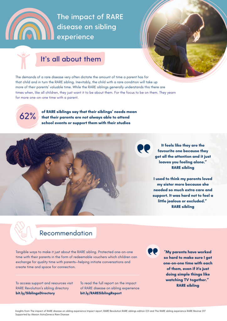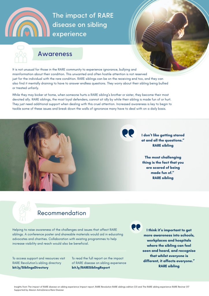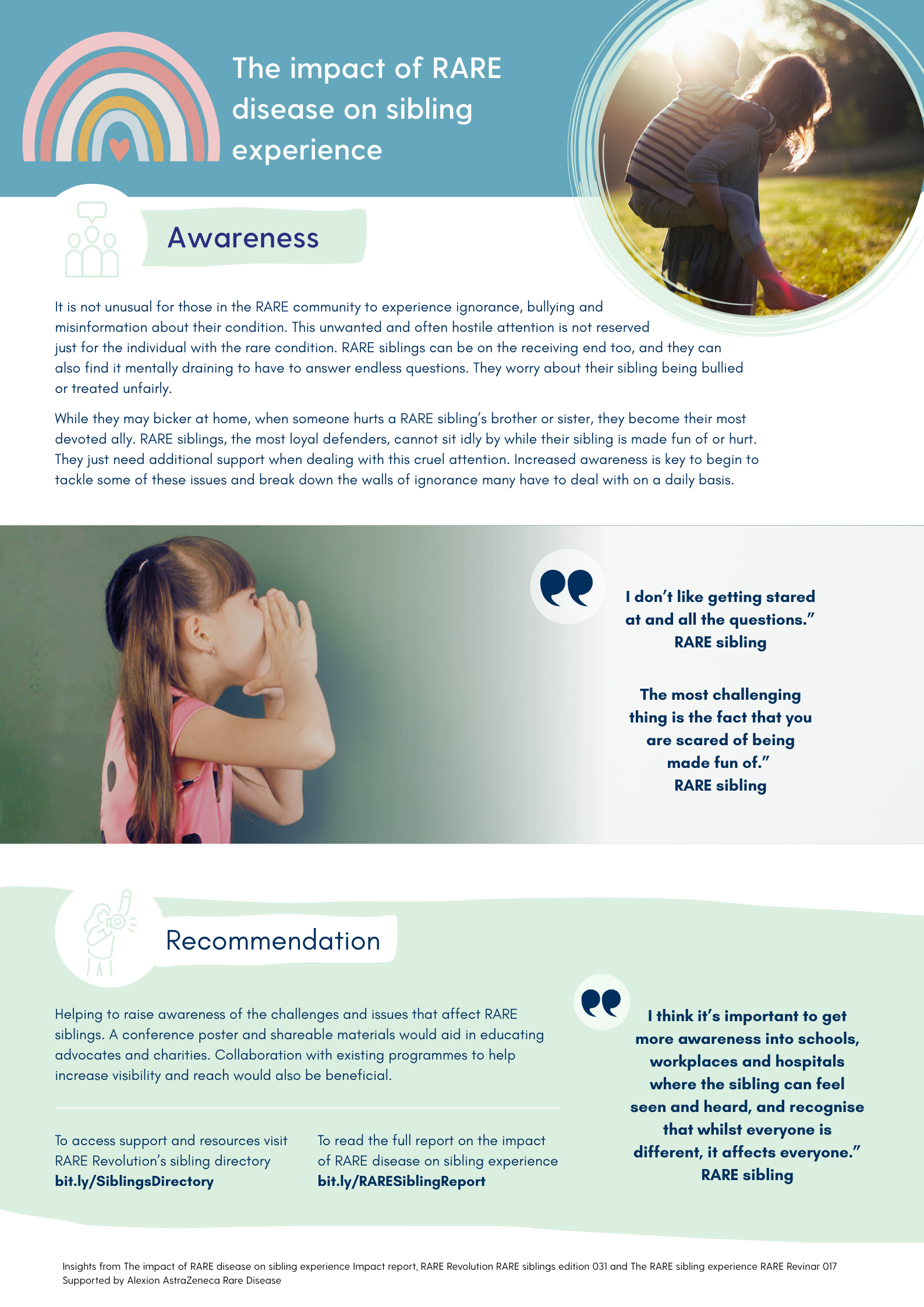 The impact of RARE disease on sibling experience impact report, undertaken by RARE Revolution Magazine and supported by Alexion, AstraZeneca Rare Disease, aims to give a voice to RARE siblings. The report shares the personal insights of young people living with RARE embedded into the fabric of their family life, who want—and deserve—to be recognised, supported and heard.