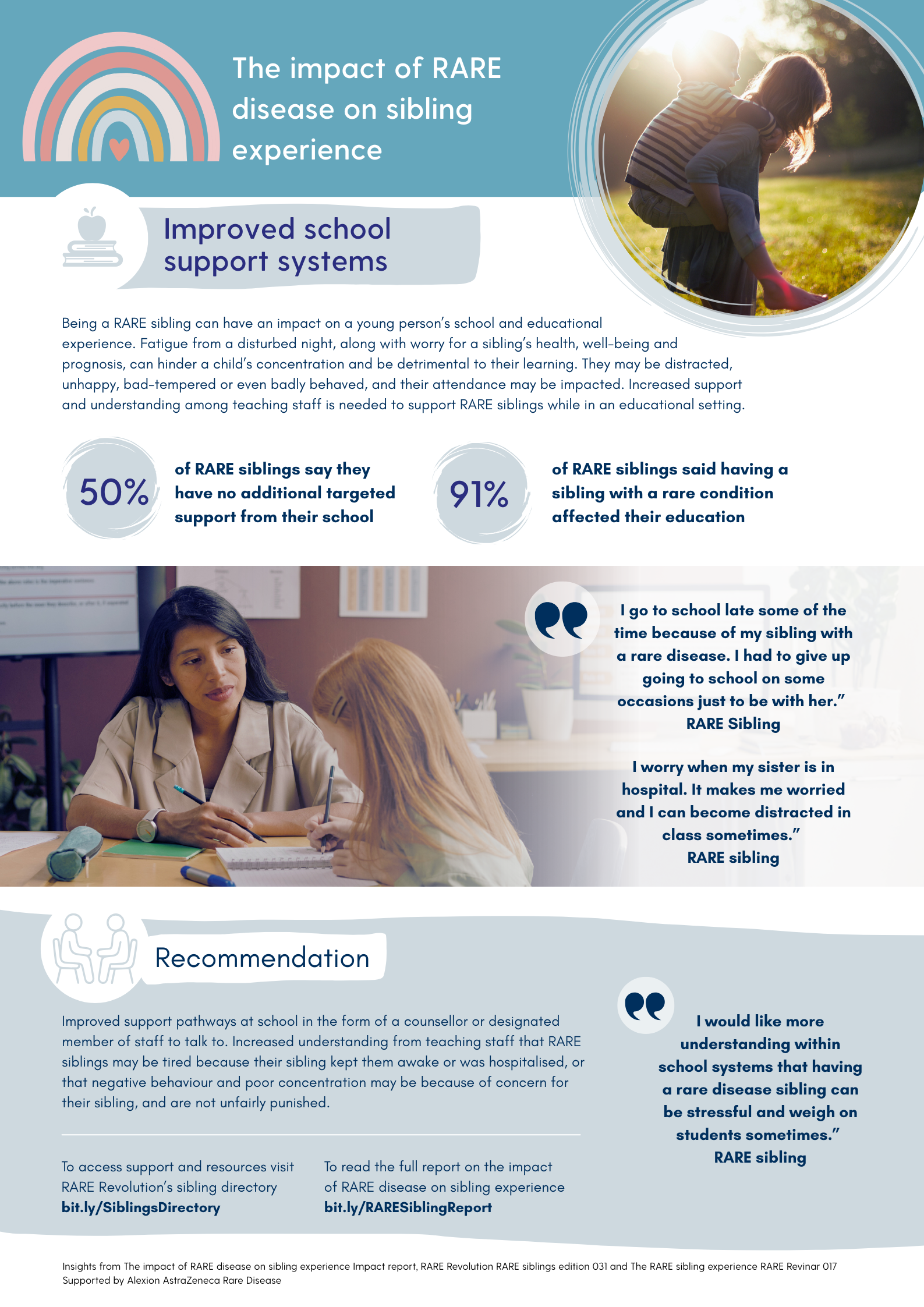 From the impact of RARE disease on sibling experience impact report, came seven key recommendations for how best to support and nurture the RARE sibling across various aspects of life.