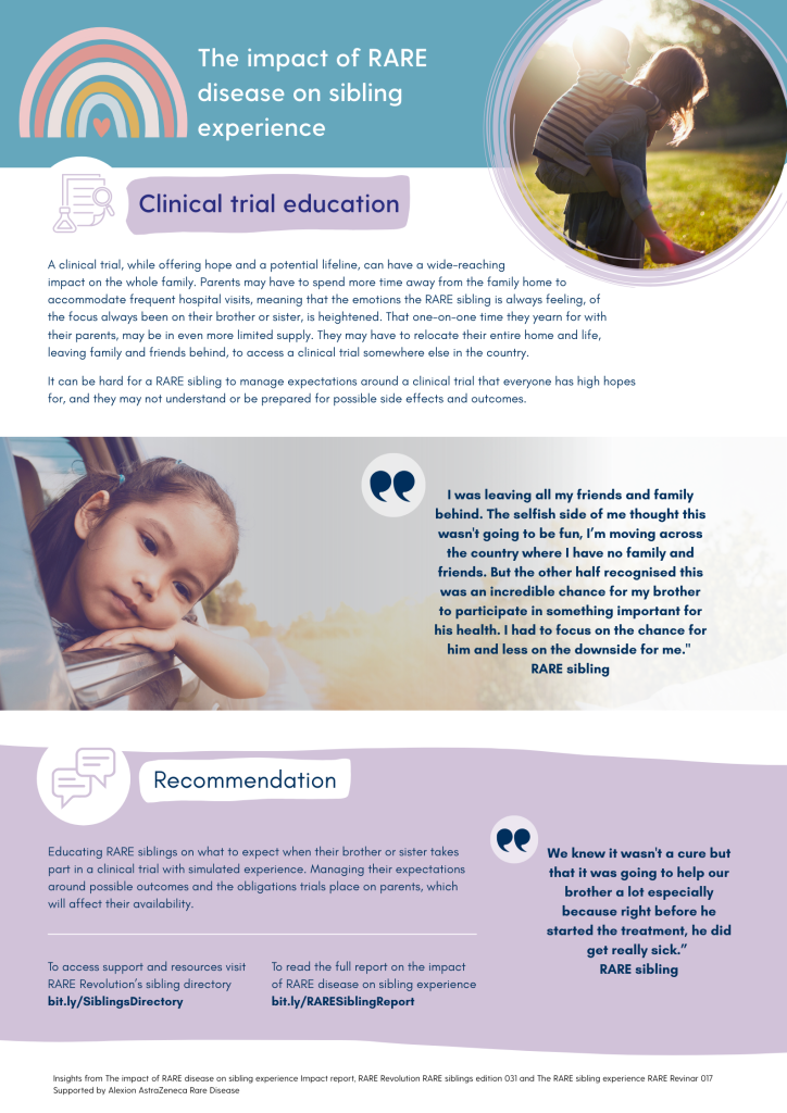 The study comprises insights from 52 RARE siblings across two age categories: 23 participants aged 8–16 and 29 participants aged 17–25, alongside facilitating carers, captured in June and July of 2022. Participants from the UK and USA represent over 35 different rare conditions. Through the invaluable insights provided by these RARE siblings, the report highlights the impact siblings experience in their education, family life and relationships and makes recommendations to support and nurture this unique group of young people. Insights and recommendations can serve as a useful guide to all organisations operating in a support capacity within rare disease—aiding their short and long term strategic aims for whole family support.